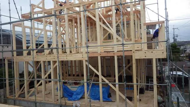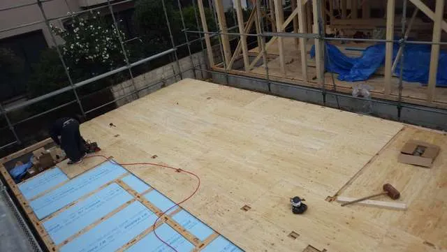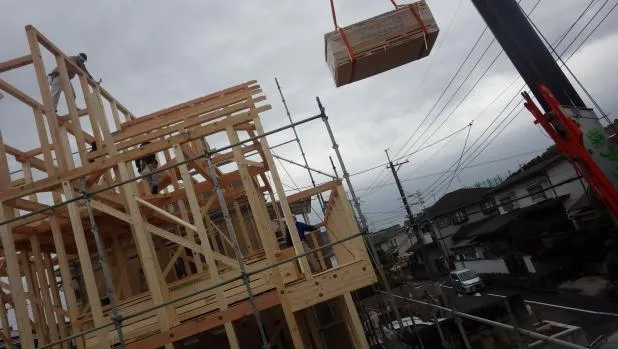 京阪沿線,新築木造戸建,クレーン上棟工事から迅速に構造合板施工雨終い対策