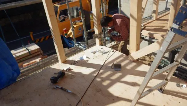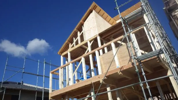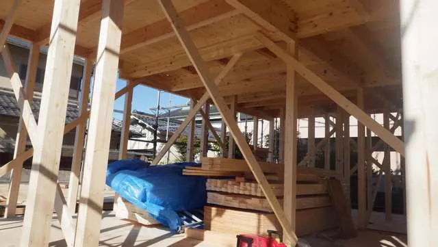 京阪沿線,新築木造戸建て,土台敷き,クレーン上棟工事から迅速に構造合板施工