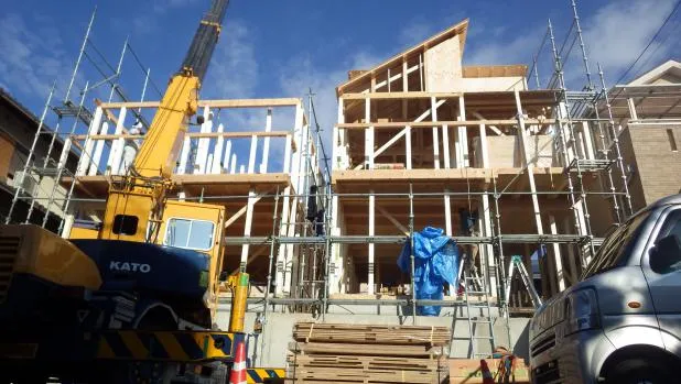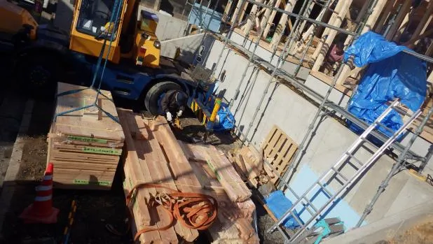 国家一級施工管理技士による工程管理と施工手順の内容により新築施工経験と実績の豊富な関西ホームズの最適な2棟当時進行施工プランです。資材搬入,クレーン車,上棟工事。