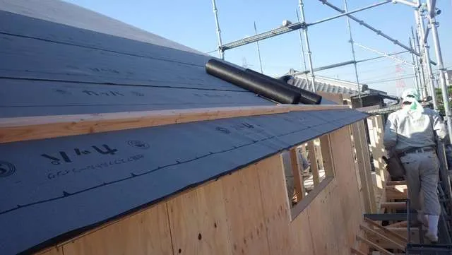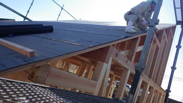 屋根雨終い木造新築施工管理。迅速にアスファルト屋根ふき用紙,ルーフィング施工です。