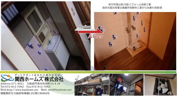 京阪沿線枚方市築30年住宅,内装リフォーム,洗面台水廻り改修解体工事,水漏れ修理