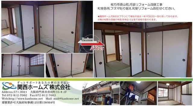 京阪沿線枚方市,内装リフォーム,和室リフォーム,襖貼り替え施工,¥3320~おまとめ価格でさらに!!
