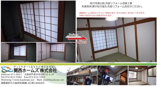 京阪沿線枚方市,内装,和室リフォーム,障子貼り替え施工,¥2480~おまとめ価格でさらに!!