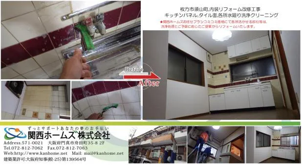京阪沿線枚方市,内装リフォーム,キッチンパネル,タイル面,水廻り各所,洗浄,クリーニング処理