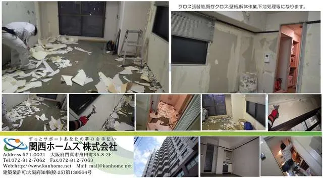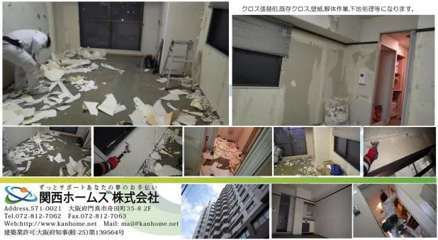 収益物件,マンション内装リフォーム,壁紙,クロス張替前,下地処理,既存クロス解体処理になります。マンション等,クロス張替,内装リフォームは関西ホームズ㈱にお任せください。
