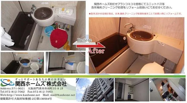 関西ホームズ,内装リフォームお任せプランコミコミ価格にて,各所活かせる部分は洗浄,清掃等、クリーニング処理からお買い得なリフォームをご提供いたします。ユニットバスのクリーニング等,お悩み方,お住まいの総合サービスを目指す関西ホームズにお任せください。