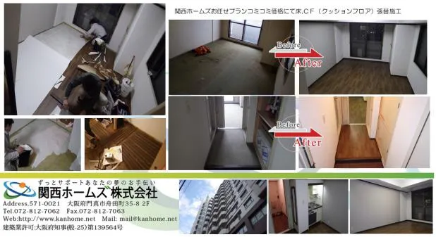 関西ホームズお任せプランコミコミ価格にて,既存カーペット解体からCF施工,クッションフロア張替施工です。壁紙,クロス施工に際して取り合い部分はソフト巾木施工で全体的な納まりを経験から最適なプランをご提案,施工とお任せください。