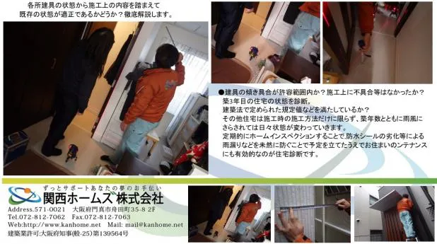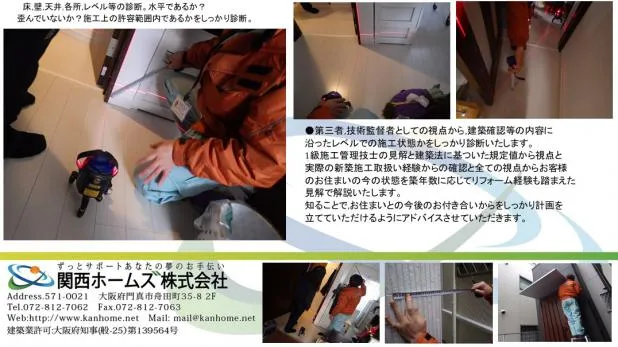 中古住宅は、時間の経過により常に劣化をしていきます。大切なのは、その劣化が、どの程度のものなのか、ということ。数多くの物件を見るだけでなく又、実際にリフォームや建替え等を行ってきた職人や建築に精通した資格者でなければ、正確な確認は出来ません!! 又 1級建築施工管理技士,建築士等の専門家の現場経験や目利きが役立ちます。 本当に家屋に影響する箇所と影響を及ぼさない箇所があり実際に現場での工事をする者、以外知りえない所も御座います。 不要なリフォームで高額な金銭は不要です。 必要箇所だけにしぼり、どの工法でリフォームをしたら良いのかを、お客様と一緒に考え最適な工法を提案いたします! より良く、住み良い、快適な住環境を目指し、お客様と当社で一緒に実現しましょう!! 又、引き渡し後に、発見された建物に問題が発生し、生活に支障が出る、リフォームや修繕に予想以上の出費が出る、入居後に生じた問題のため、責任の所在があいまいになる・・・など数多く問題はありますが、その様な問題も、当社が誇る経験実績の豊富な住宅診断