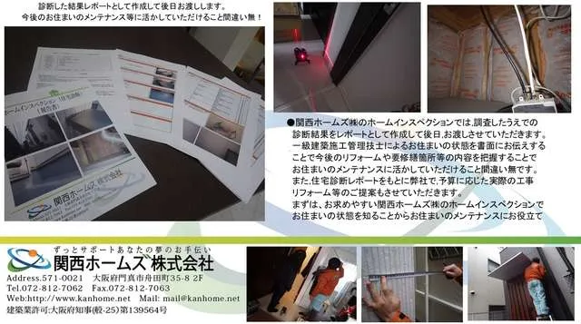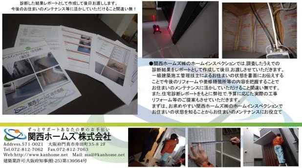 当社から診断結果報告書を発行! 中古物件を購入予定のお客様、、是非ご利用ください! 安心できるリフォームの提案、又,リフォーム被害等の防止の為、適正価格の提示、どの様な事でも、お気軽にご相談ください!