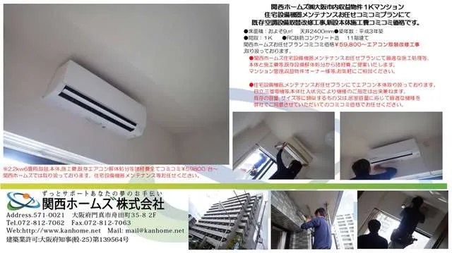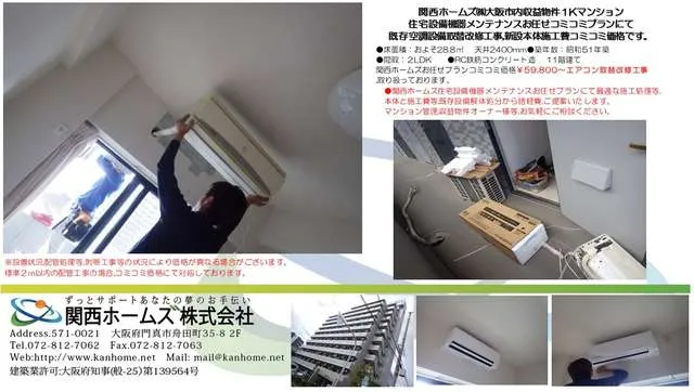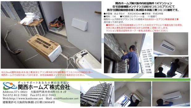 大阪市内収益物件、マンションオーナー様等,住宅設備メンテナンスお任せ改修工事プランにてエアコン,空調設備等,本体から施工費等コミコミ価格¥59800~取り扱っております。既存設備,取り外し解体から設備機器処分費等,諸経費全てコミコミ価格です。