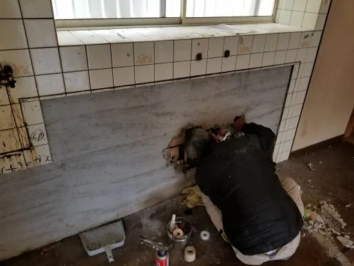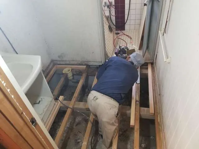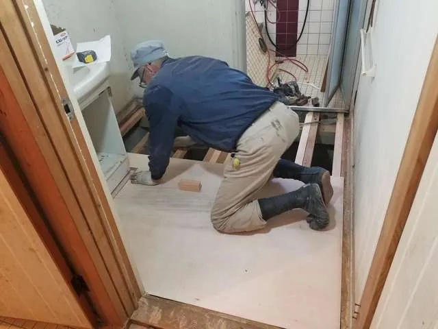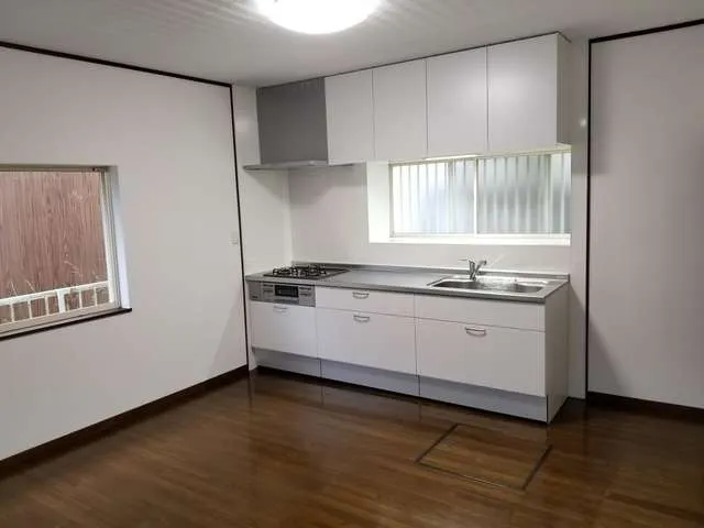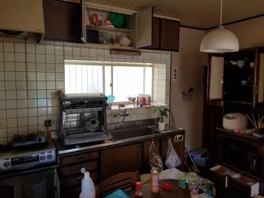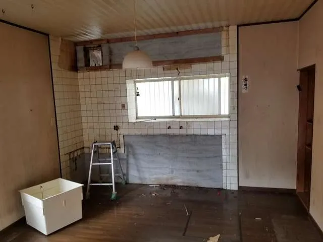 システムキッチン新設、洗面床構造補強、補修、内装クロス張り、天井下地工事、残置物処理運搬、波板張替、和室壁クロス下地、ガス工事、その他