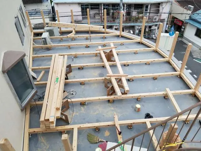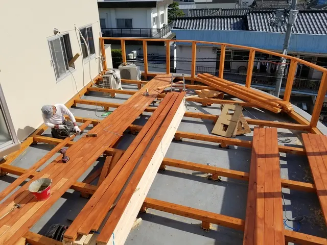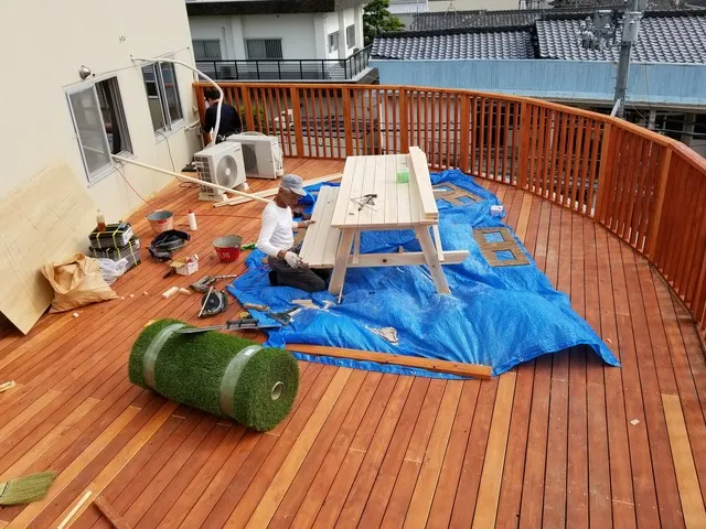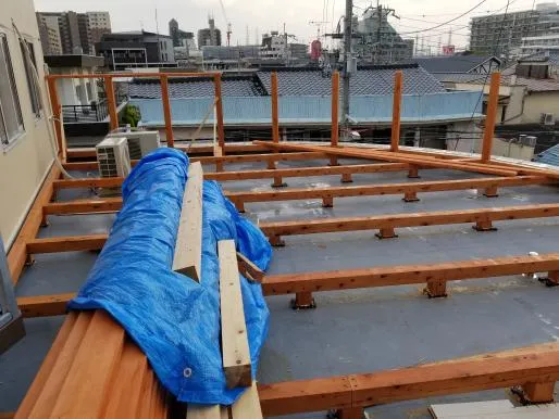 屋上に防水工事からウッドデッキの施工完了致しました。
