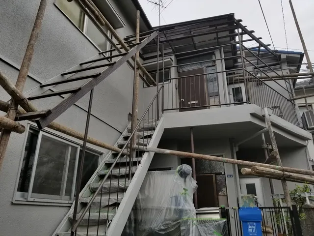 丸太足場工事・外壁修繕・ベランダ解体・各所大工にて軒天井の下地工事・樹脂モルタルでのクラック補修・高圧洗浄・波板張替・シーリング工事・内装塗装工事など
