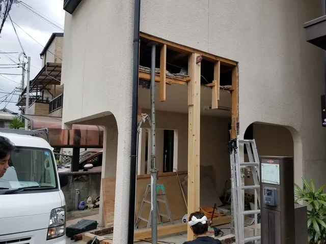 2階増築部分の1階ガレージ部の補強工事です。 既存増築部の不具合や強度不足を解消しました。