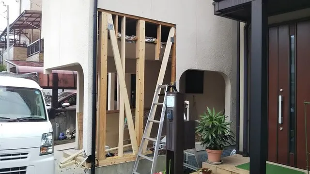 壁が無く耐力が全くありません。 地震の影響で柱が移動し不具合が生じております。 柱や筋交いを追加し補強致します。