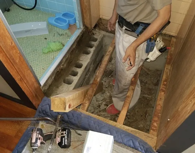 屋根全面修繕工事・棟積み替え・浴室床タイル張替・洗面室軸組み新設・補強・フローリング張り工事・外壁クラック修繕・その他