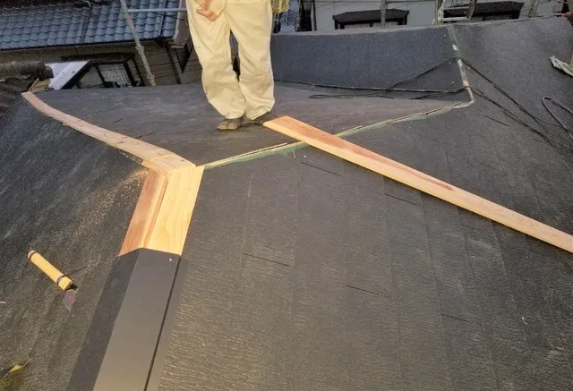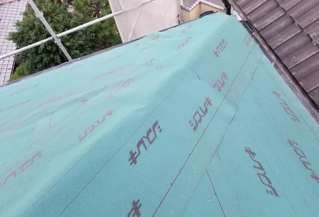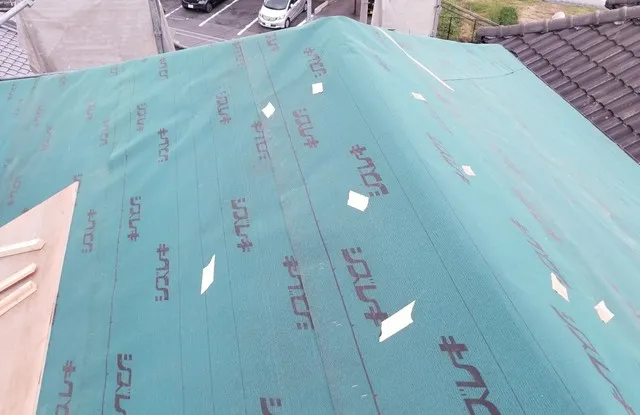 棟部の下地ルーフィング工事です。 棟部や谷部・ケラバ部は二重にルーフィングを施工。 台風21号による屋根の修繕・葺き替えはお任せください。