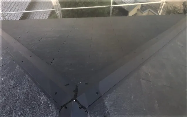 台風21号による屋根の葺き替え工事完了です。 棟の板金部分は側面止めを正面止めに変更しました。 枚方市で屋根の葺き替え工事完了致しました。