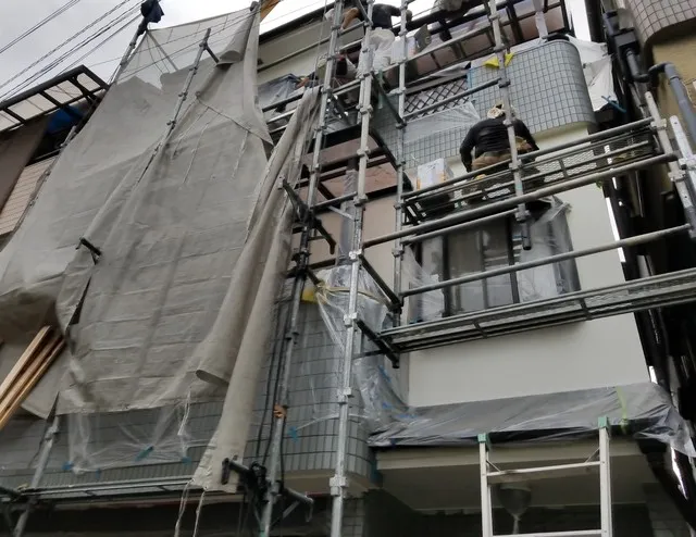屋根が急こう配の為足場を設置し外壁塗装も一緒に実施いたします。