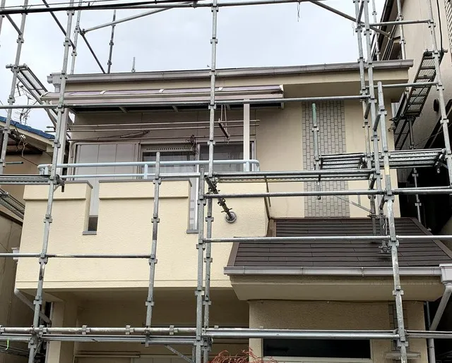 4面足場を設置し近隣に配慮致します。又、安全に施工する為に足場の設置は必須です。