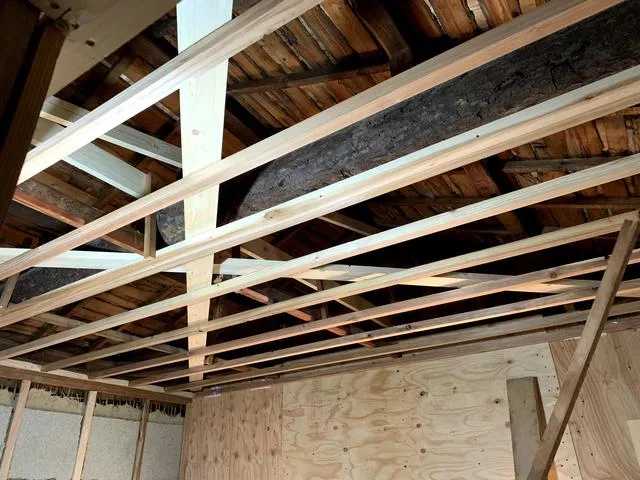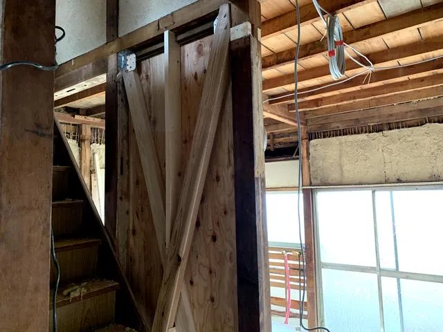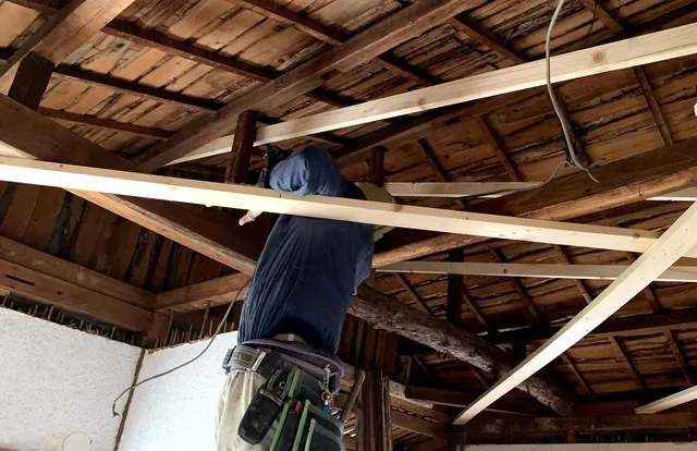 2階居室の天井や壁を解体し構造補強を施します。 水平耐力を向上させ台風や地震による構造のひずみを抑制する為、補強を致します。