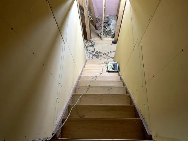 階段の踏面を広げ昇降しやすい様に改修いたしました。 壁面も大壁でクロスを張れば綺麗に仕上がります。