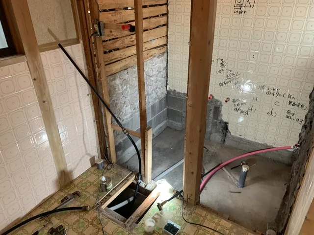 浴室解体後に土間モルタル打設を施し各配管や電気配線の仕込み工事です。