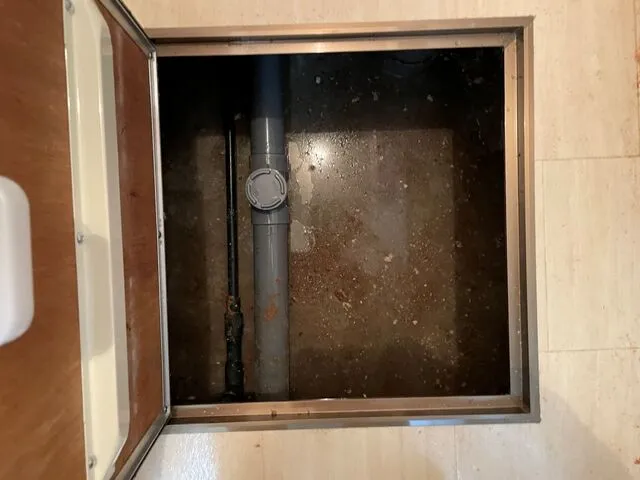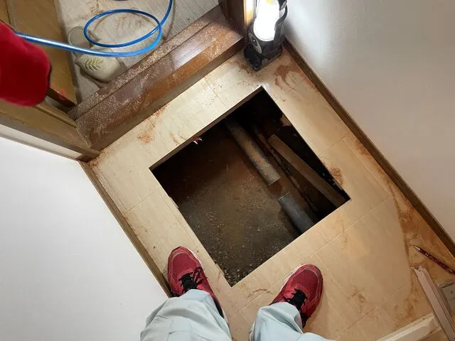 点検口を新設し床下配管を切断、高圧洗管いたしました。