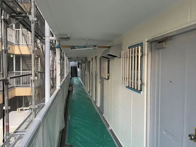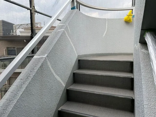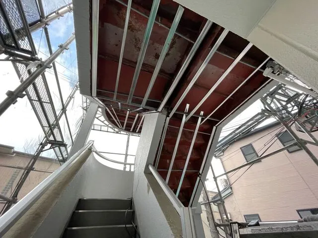 外壁塗装・ALC目地シーリング・共用階段天井修繕・軽鉄下地・ケイ酸カルシウム板張り等