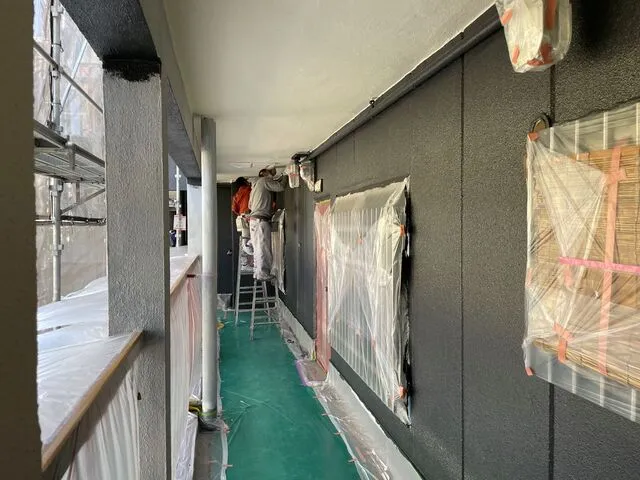 収益マンションの外壁中塗り塗装工事に着手いたしました。