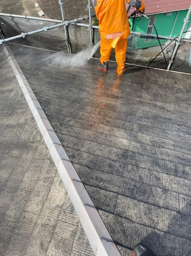 コロニアル瓦の高圧洗浄です。塗料の密着性能を向上させ耐久性も向上