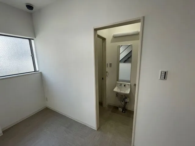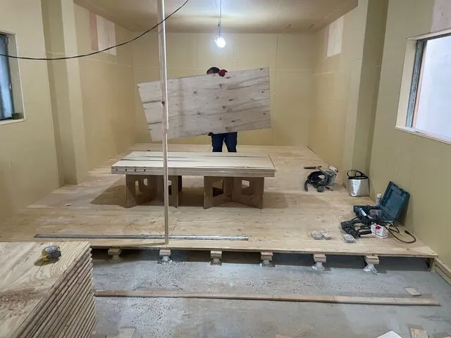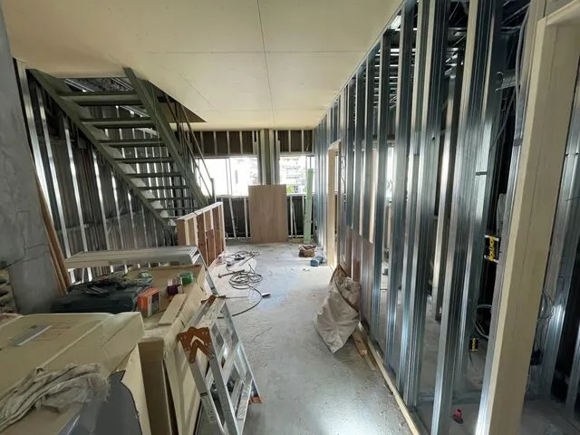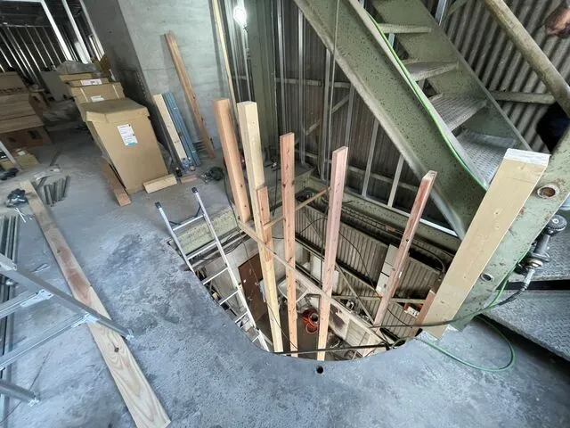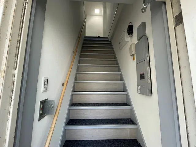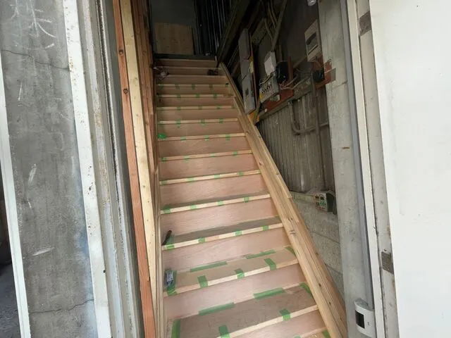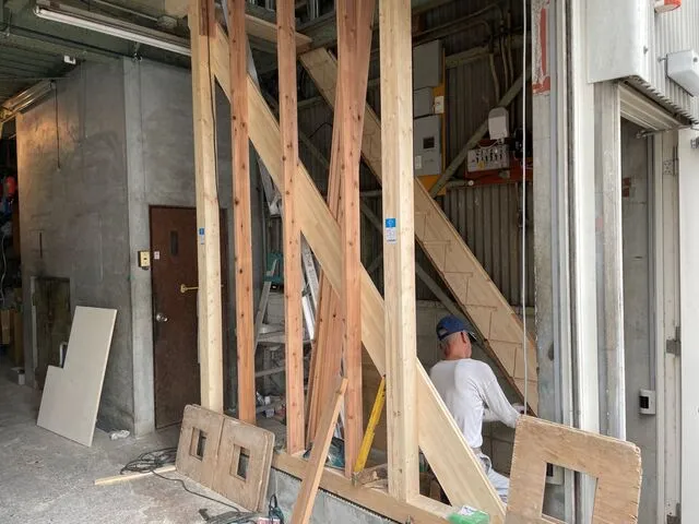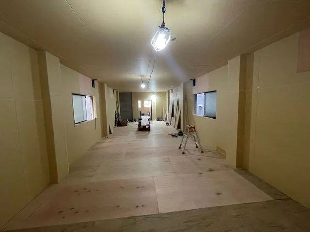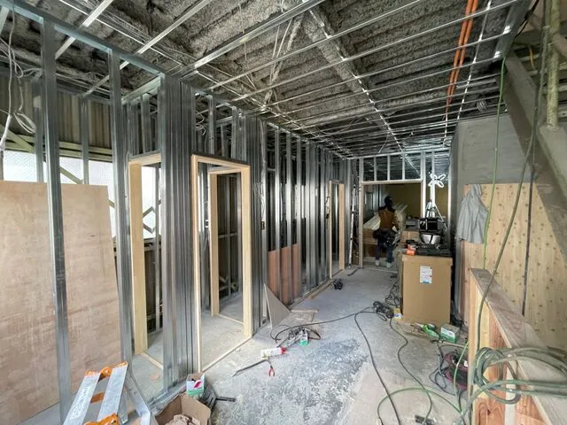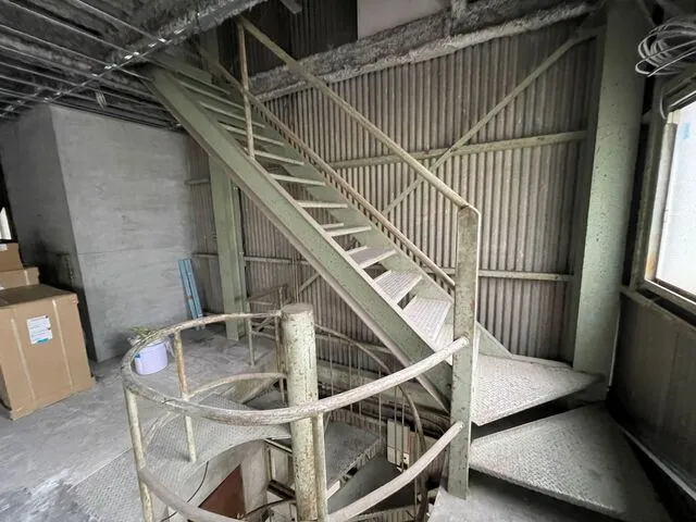 軽天下地・ボード工事・トイレ2か所・洗面・ダウンライト・ベースライト・備品取り付け・エアコン工事・スイッチコンセント・換気扇・ミニキッチン・電気温水器・床上げ工事・フロアータイル工事・鉄骨螺旋階段解体・造作階段新設・分電盤新設・左官下地工事・足場工事・塗装工事・基礎工事・その他