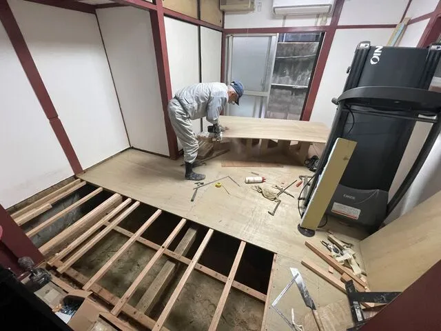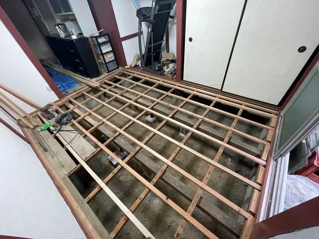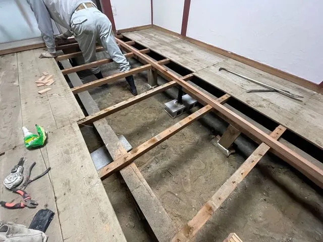 床改修工事・床軸組み補強工事・束追加・束調整・根太工事・合板張り・建具工事・