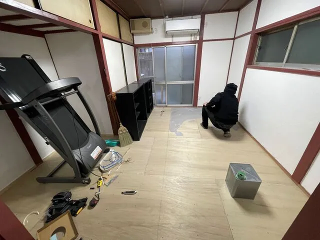 解体工事中 畳表面に施していた既存フロアを撤去