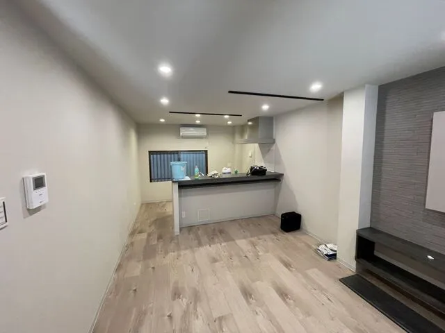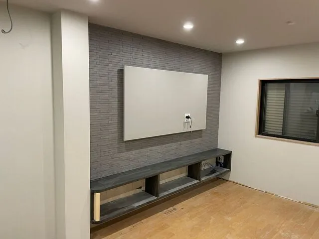 リビングのリフォームが完成です。カウンター造作・TVデザイン収納等造作・TV部間接照明・エコカラット工事