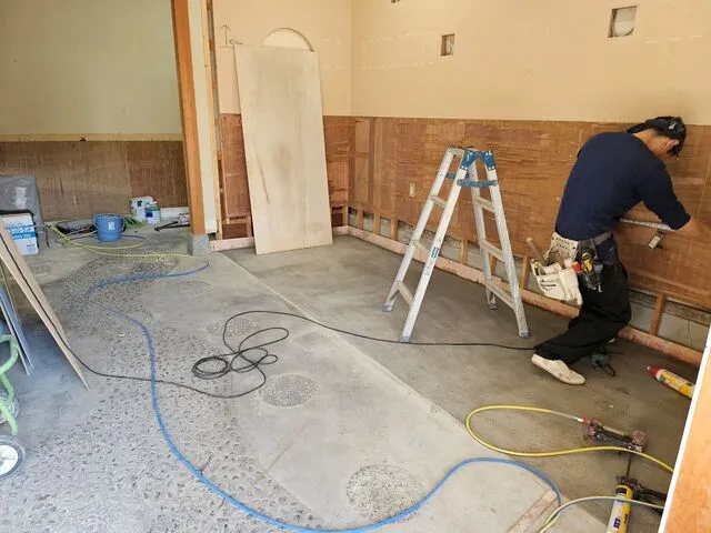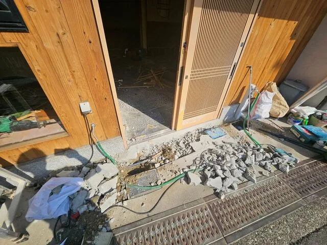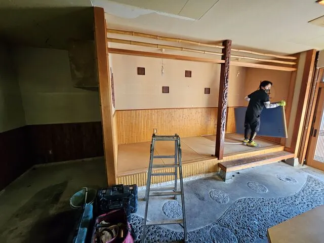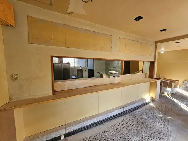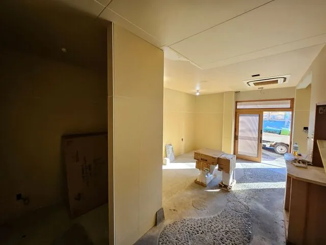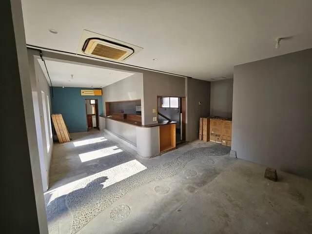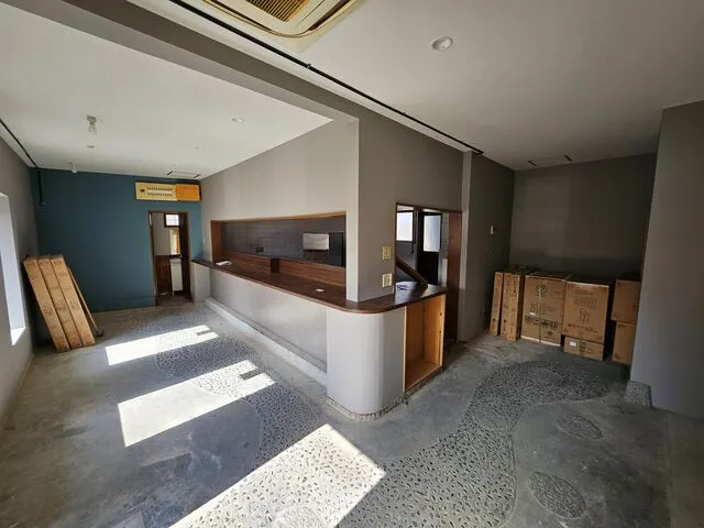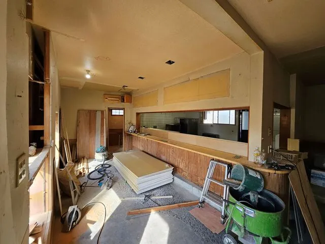 アルミサッシ2カ所新設・外装補修・焼き板張り・トイレ交換・洗面トイレ間取り変更・ホール内改修・解体工事・電気工事・大工工事・キッチンパネル張り・水道配管検査・水道配管新規配管・水栓新設・電気配線改修・ダウンライト照明新設・厨房等洗い工事・建具工事・設備工事・塗装工事・カウンター表層工事・内装クロス・フロアータイル・ハウスクリーニング等々・・・その他