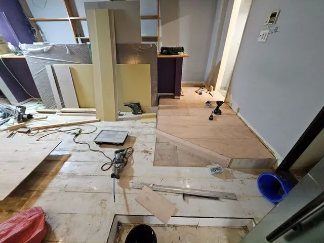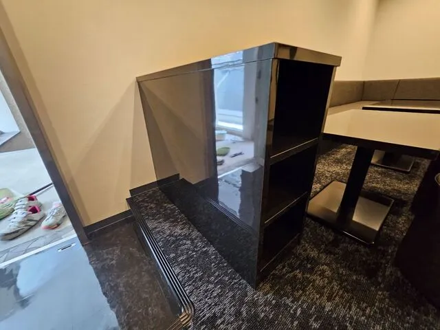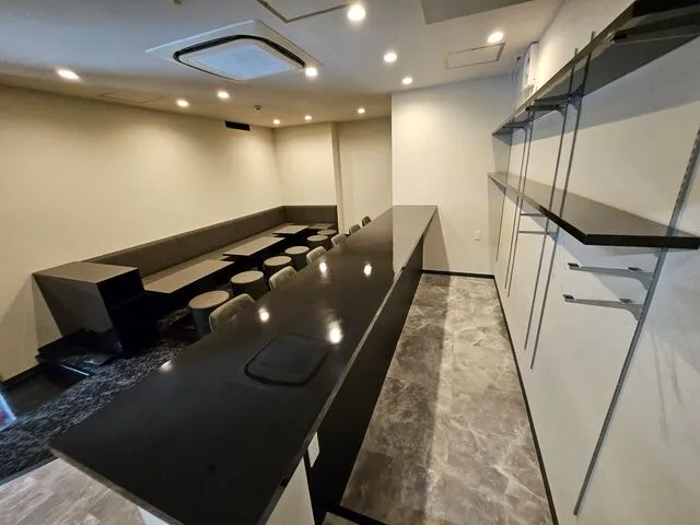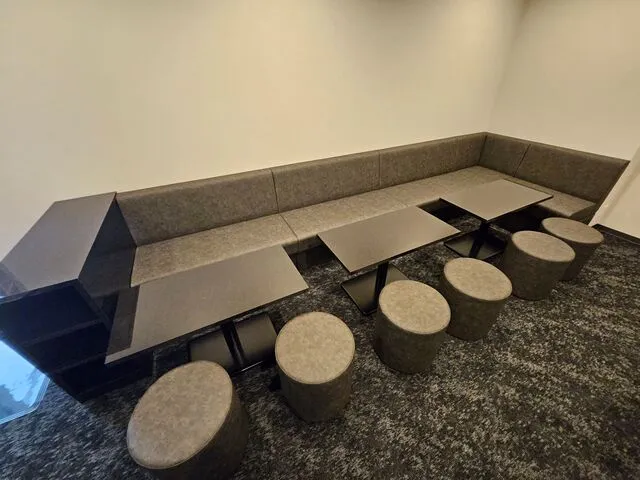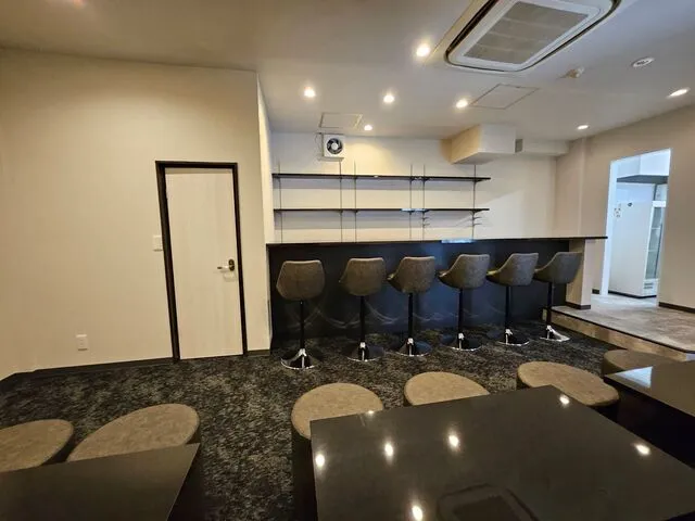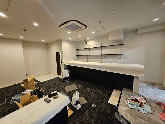 テナント内装改修工事・ソファー・テーブル・カウンター椅子・椅子・家具造作工事・メラミン張り工事・棚板新設工事・タイルカーペット・フロアータイル・クロス下地ボード張り工事・キッチンパネル工事・内装塗装工事・厨房FRP防水工事・建具新調工事・電気工事・ダウンライト照明調光器付き新設・スイッチコンセント交換・エアコンクリーニングその他