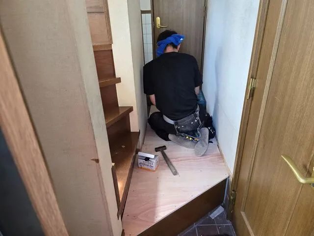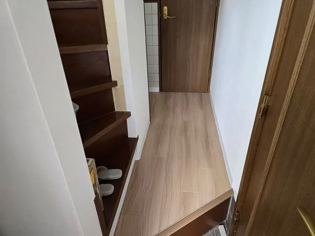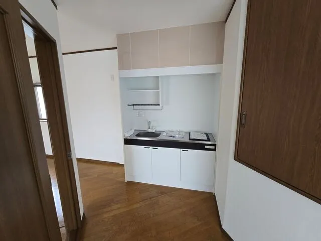 店舗内部照明交換・換気扇交換・居住スペース内装リフォーム・廊下床面合板張りクッションフロア仕上げ・洗濯置き場改・配管改修・洗濯パン新設・トイレ交換・IHミニキッチン新設・シロッコファン新設・電気改修・ガス配管改修工事・その他雑工事・アンテナ工事