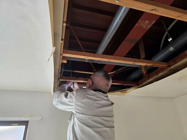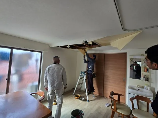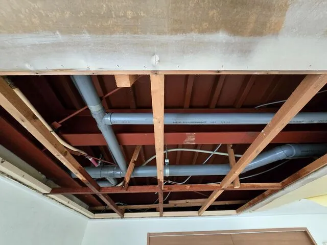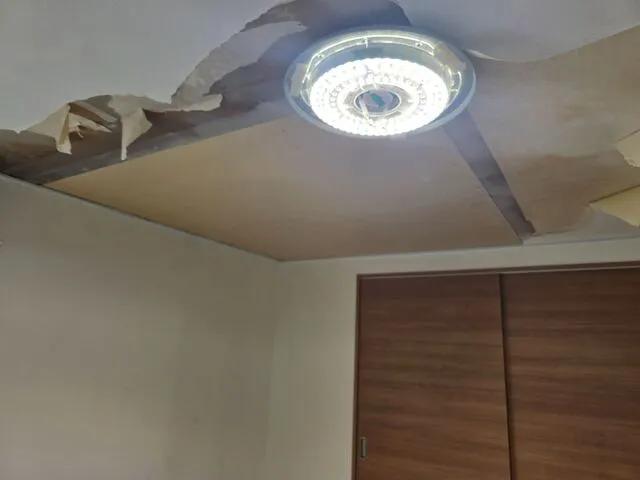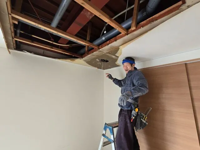 既存天井を捲って修繕となります。内装クロス復旧は後日